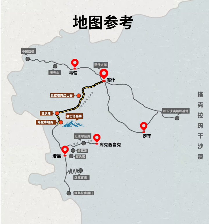 👉前往帕米尔高原地区,途中可车览西域维吾尔族农家田园风光。 🚩前往【奥依塔克红山】这里高山险峻,因山体呈现红色而得名,【远观】奥依塔克红山并拍照,在这里可以购买氧气袋。